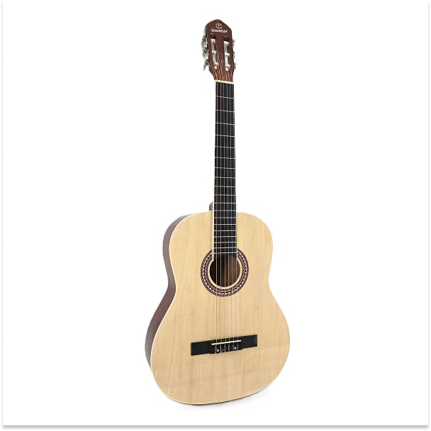 This UNISTAR EC3600-N 36″ classic guitar is the perfect choice for beginners and intermediate players seeking rich tones and comfortable playability. Its 36-inch compact size makes it ideal for younger musicians or those who prefer a more portable guitar. The guitar features a smooth wooden top with a natural finish that enhances resonance and durability. With nylon strings and a classic-style neck, it offers a warm tone and easy fretting. The included padded gig bag ensures protection and convenience for travel or storage, making this guitar a great companion for practice and performance alike.